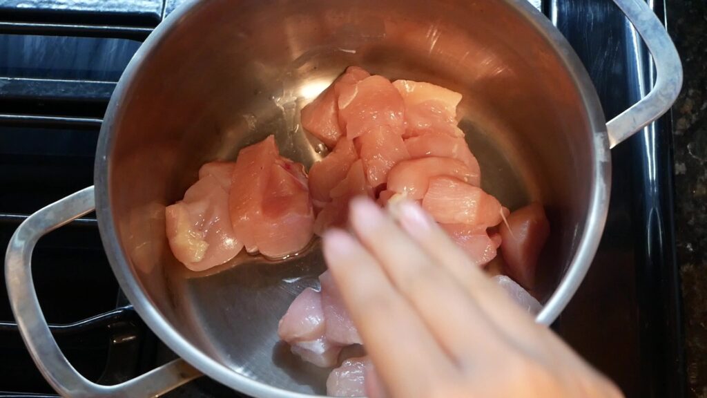 - Cut the chicken thighs into 1 inch chunks and season lightly with salt.
