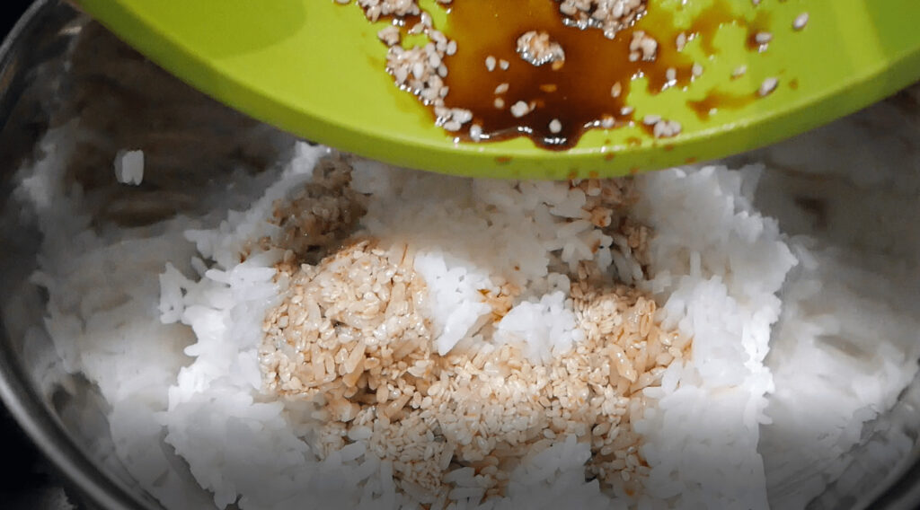 - Mix dashi powder, mirin, sesame oil, soy sauce, and white sesame seeds in a bowl.